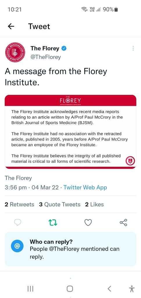 According to the Neurology Network Melbourne (above), Paul McCrory holds an honorary position at the Florey Institute of Neuroscience and Mental Health. The ‘honorary’ title generally means that he is not a salaried member of the University. Today, I find out that the Florey Institute has previously tweeted the following: