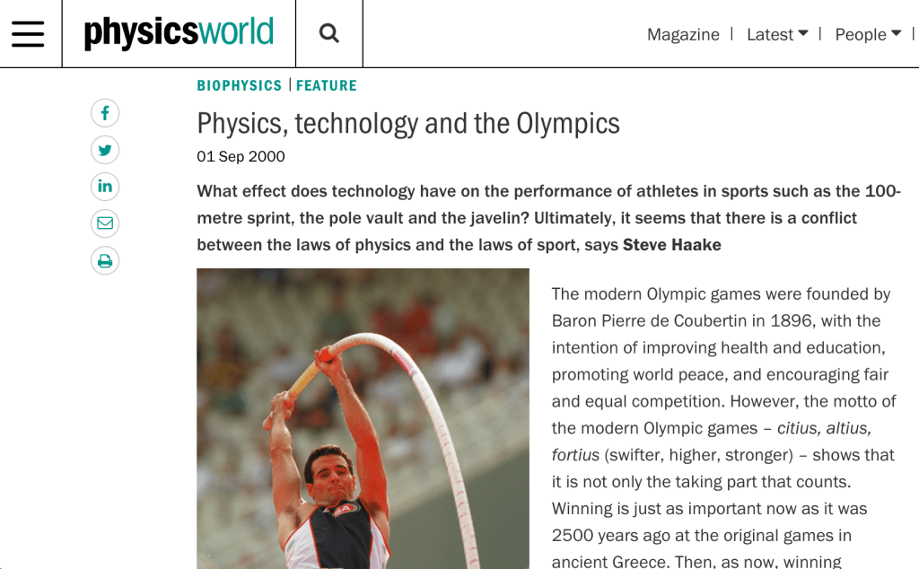 Around a decade ago, possibly around 2012-2013, I was doing a literature search when I came across a snappily titled editorial from 2005 called The time lords – measurement and performance in sprinting by a P McCrory. It was in the British Journal of Sports Medicine, a pretty decent publication published by the British Medical Journal. On closer inspection, I found that the opening words sounded very familiar. I quickly looked back at one of my own articles in Physics World in 2000 called Physics, technology and the Olympics.