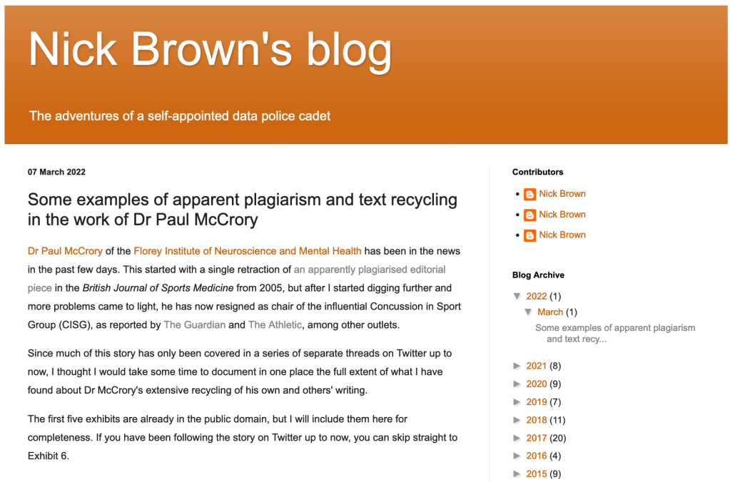 The day ends quite remarkably. Super sleuth Nick Brown publishes a withering piece, listing in a scarily forensic manner ten publications by Paul McCrory that have either plagiarised others or are self-plagiarised (i.e. copying your own work in more than one publication).