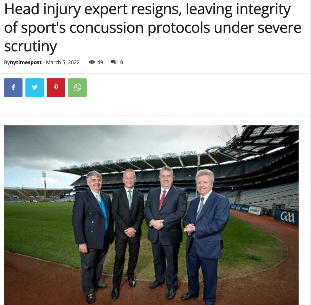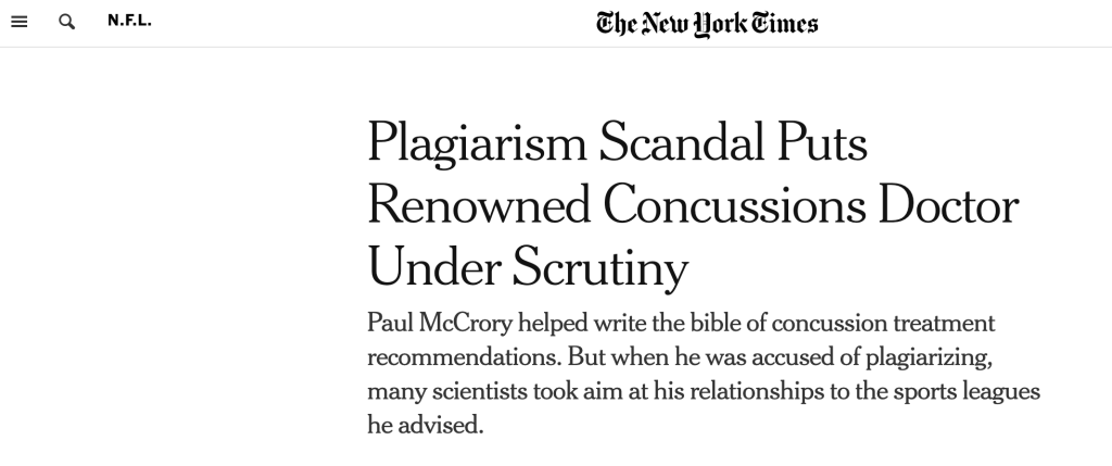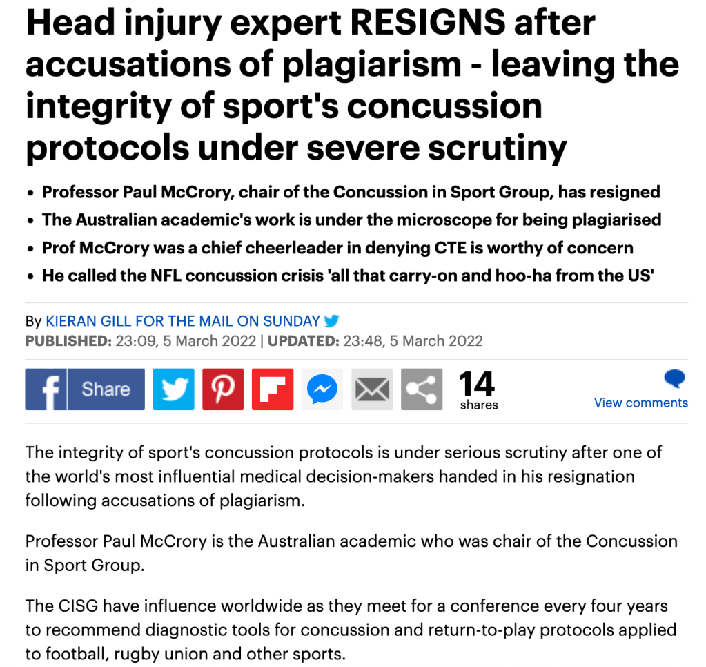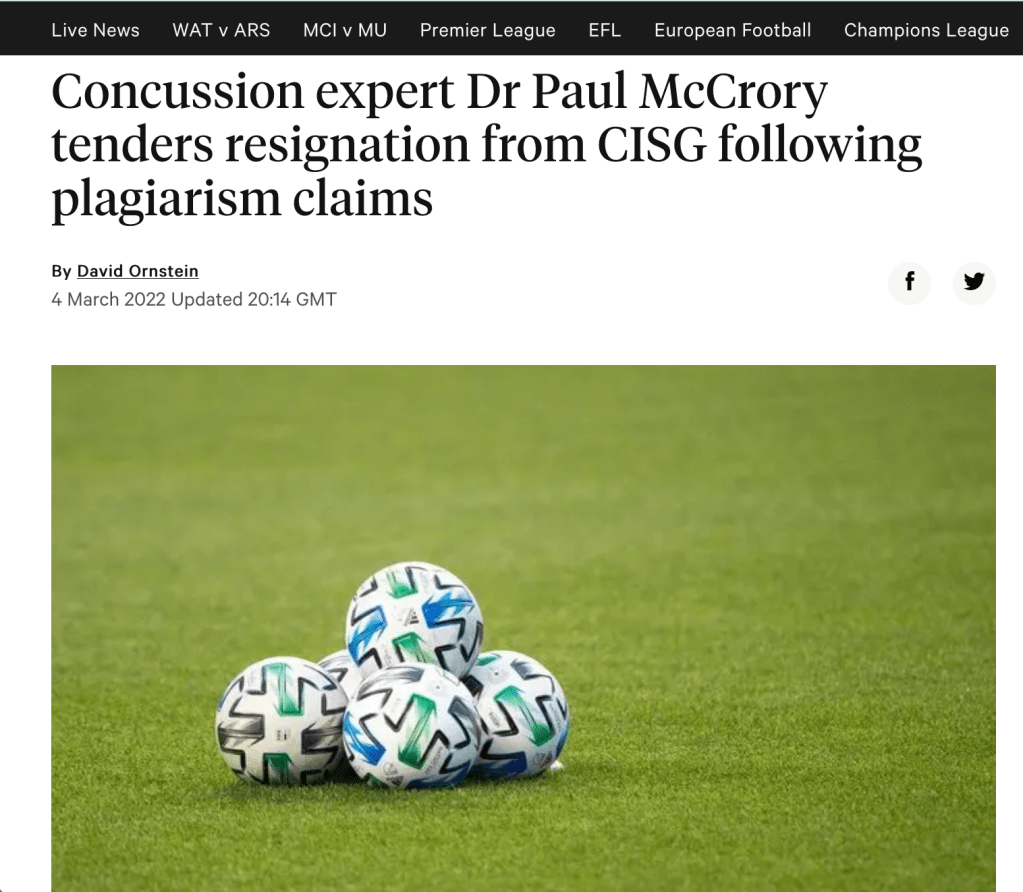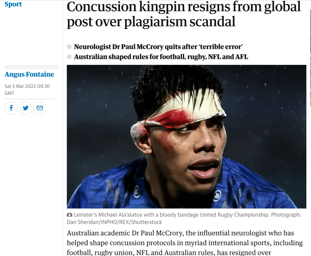 The number of plagiarised articles has reached five. The Mail Online just beats the Guardian to an piece about Paul’s resignation from the Concussion in Sport Group. The NY Times Post suggests that sport’s concussion protocols are in jeopardy.