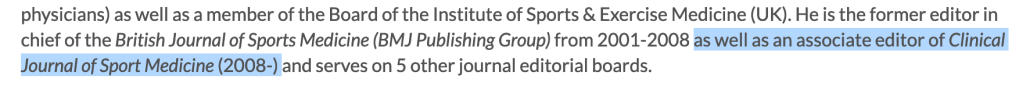 “I read your post with interest, and would like to bring attention to one small factual error within the text. The post incorrectly states that Professor McCrory is ‘still associate editor of the Clinical Journal of Sport Medicine.’ In fact, Professor McCrory has not been an Associate Editor of the Clinical Journal of Sport Medicine (CJSM) for almost the past 8 years, and he is not on the current Journal Editorial Board.“