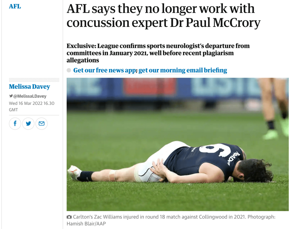 Melissa Davey, Guardian Australia’s Medical Editor has been doing her research and publishes another article on McCrory, with the news that the AFL no longer works with him and hasn’t done so since 2021.