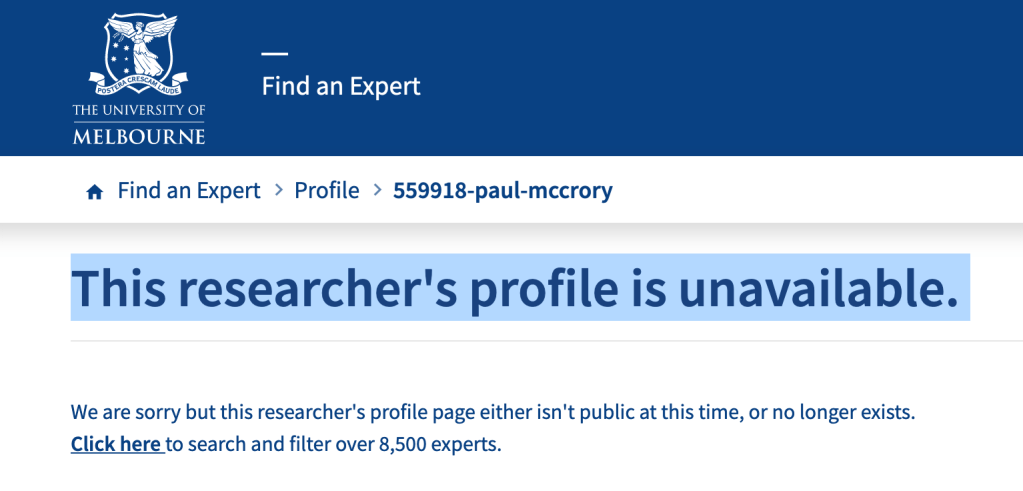 It’s gone quiet. Paul McCrory’s University of Melbourne page has mysteriously vanished and now merely has the following: