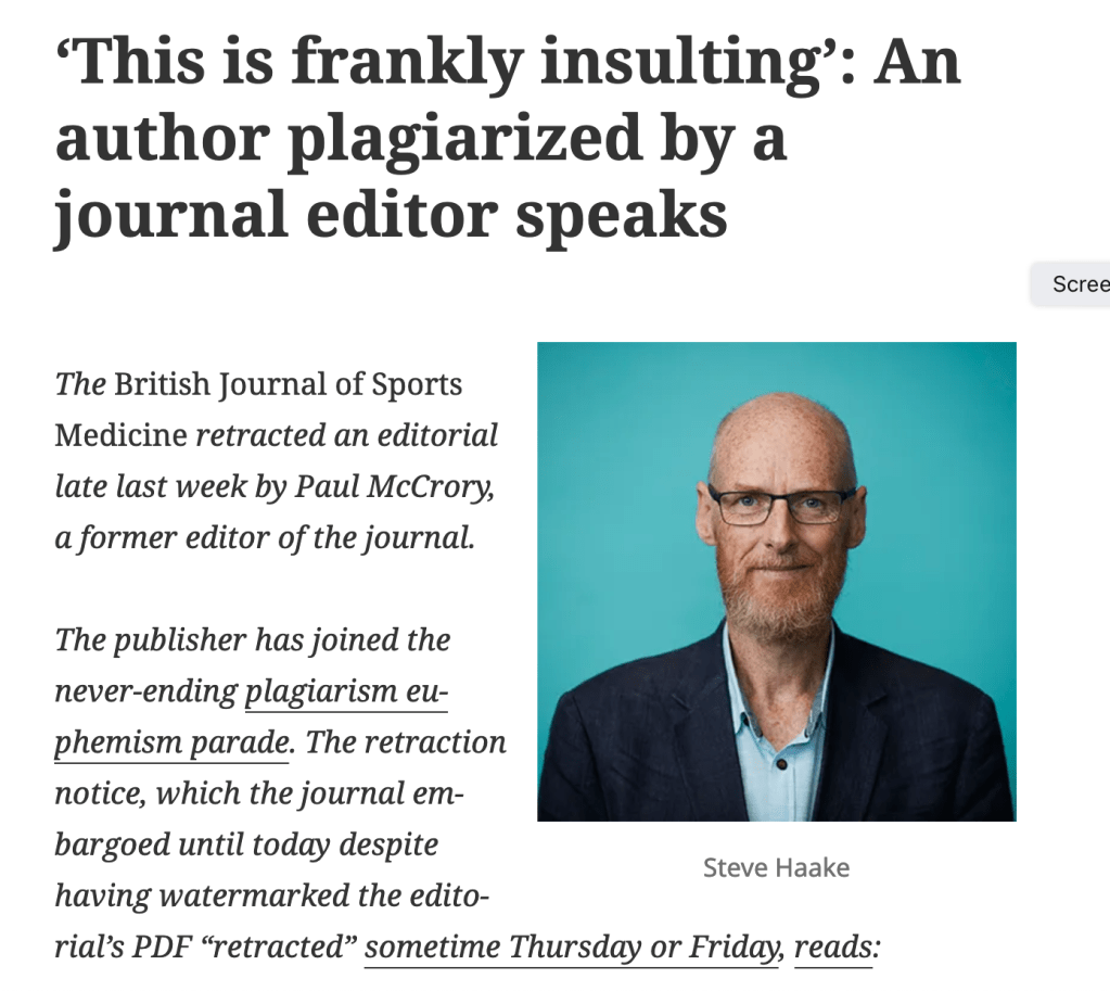 Retraction Watch publish a further article called Was leading sports medicine researcher’s plagiarism ‘an isolated and unfortunate incident? In it, Nick Brown suggests that there are more plagiarised articles to come (already knowing that there are at least two). With his 200 articles in the BJSM, he suggests they might like to check them.