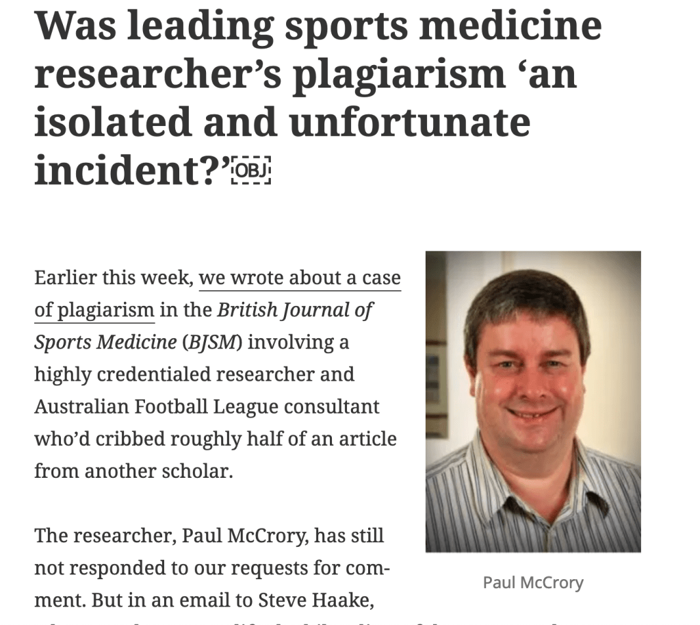 Who was this guy McCrory? I’d never heard of him. It appeared that he was an Associate Professor and a consultant neurologist at the Florey Institute of Neuroscience and Mental Health in Melbourne and had an impressive 530 articles and 34,502 citations on Google Scholar. He had the longest set of letters after anyone’s name I’d ever seen – 55 in total and – wait for this – had been the editor of the BJSM when he stole my article!